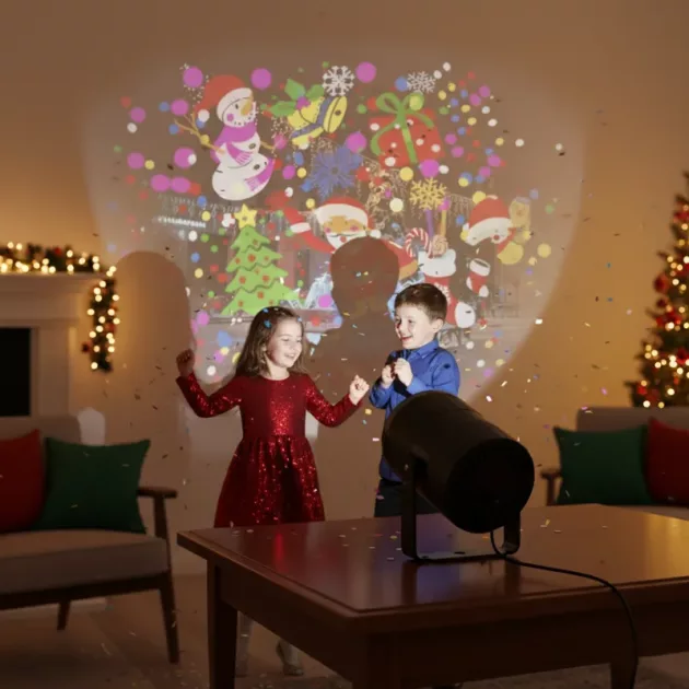 Super Spaß für Familienzeit nach dem Abendessen! Wir versammeln uns und schauen den süßen Weihnachtsmustern zu, wie sie überall tanzen. Macht unser Zuhause richtig gemütlich.