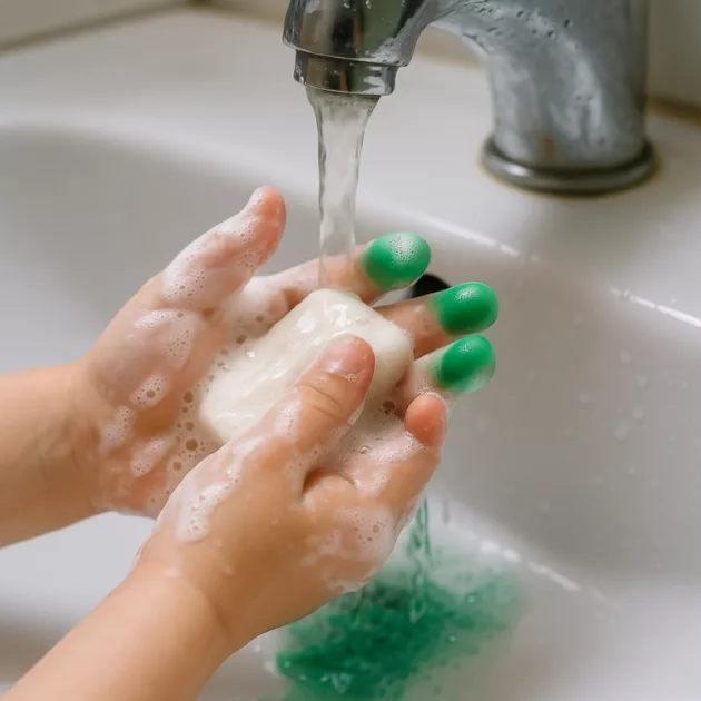 Sicher und sauber - Wasserbasierte Formel lässt sich leicht von Händen und Oberflächen abwaschen. Eltern können beruhigt sein, denn die Materialien sind sanft und ungiftig.