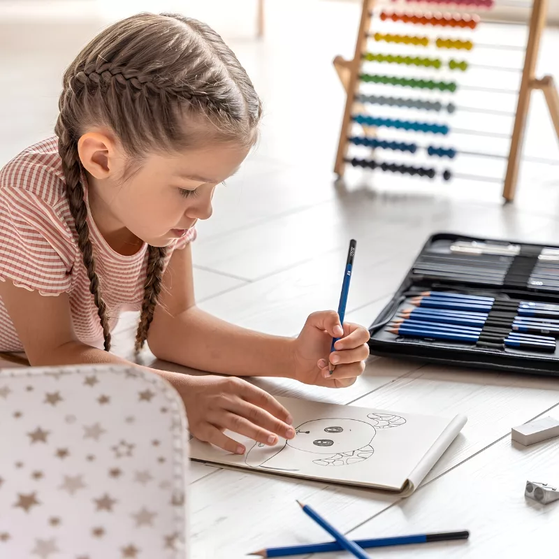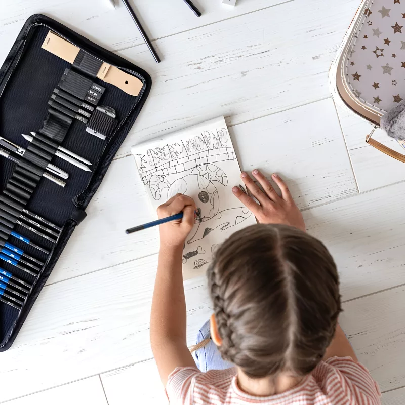 Dieses Skizzenset ist super für meine Zeichnungen zu Hause und in der Schule! Alle Stifte sind in einem Etui, also kann ich es super einfach überallhin mitnehmen.