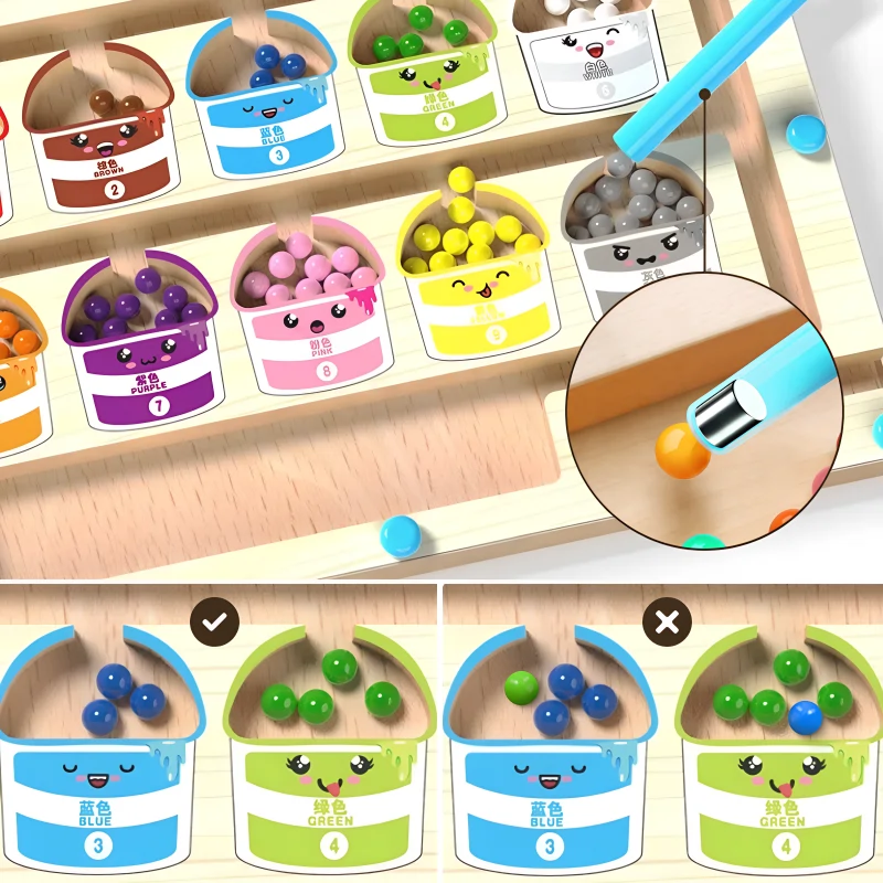Frühe Fähigkeiten - Hände führen magnetische Perlen entlang farbenfroher Wege zu passenden Zonen. Jede Bewegung verbessert das Erkennen und stärkt grundlegende Fertigkeiten.