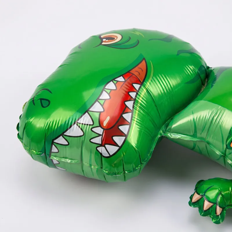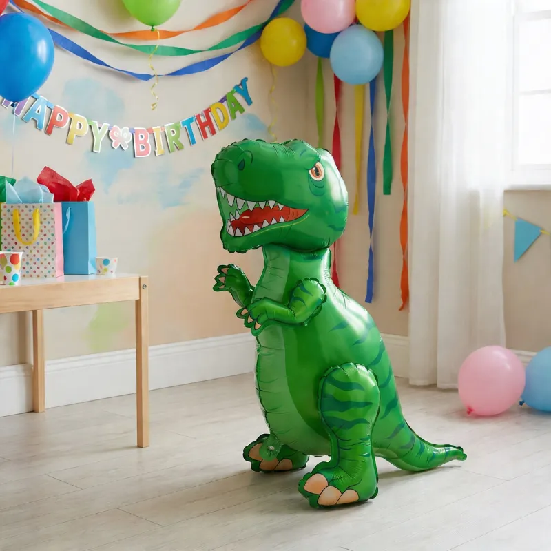 Dieser Folien-Dinosaurier hat den ganzen Geburtstag besonders wirken lassen. Er hat Kinder ausgehalten, die herumgerannt sind und dagegen gestoßen sind, und sah am nächsten Morgen immer noch frisch aus.