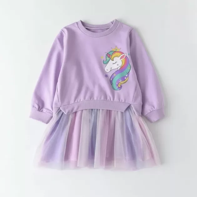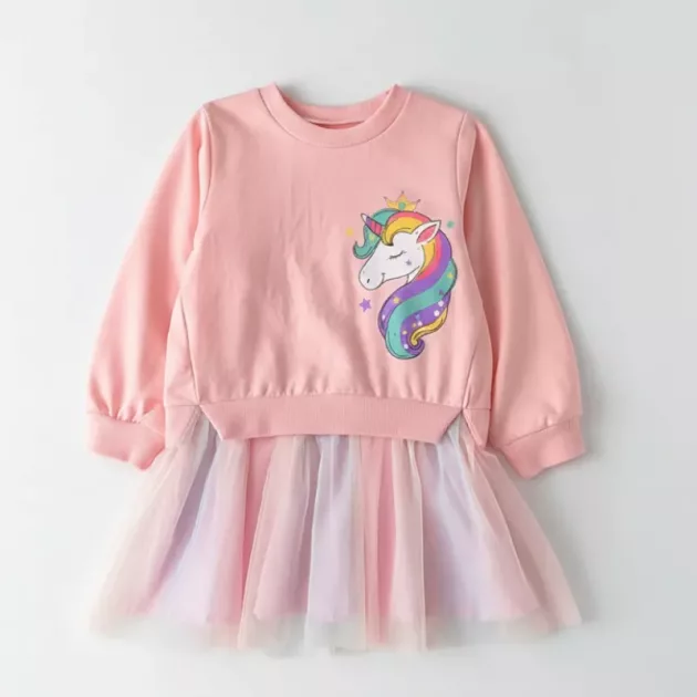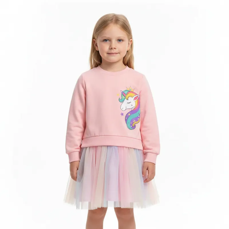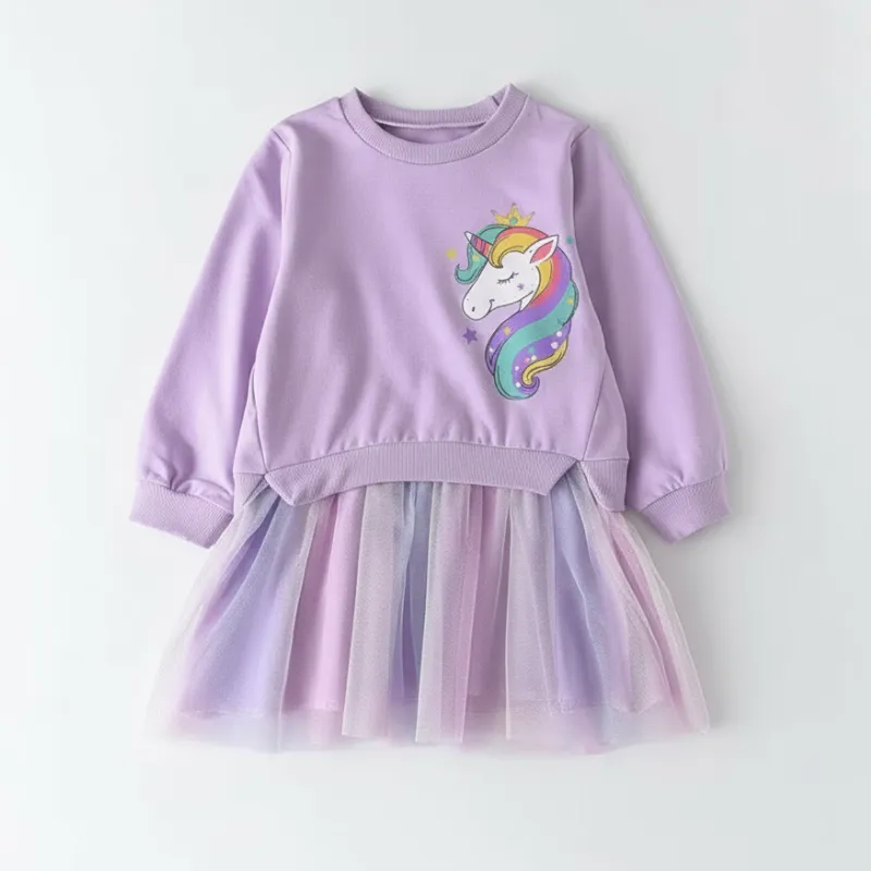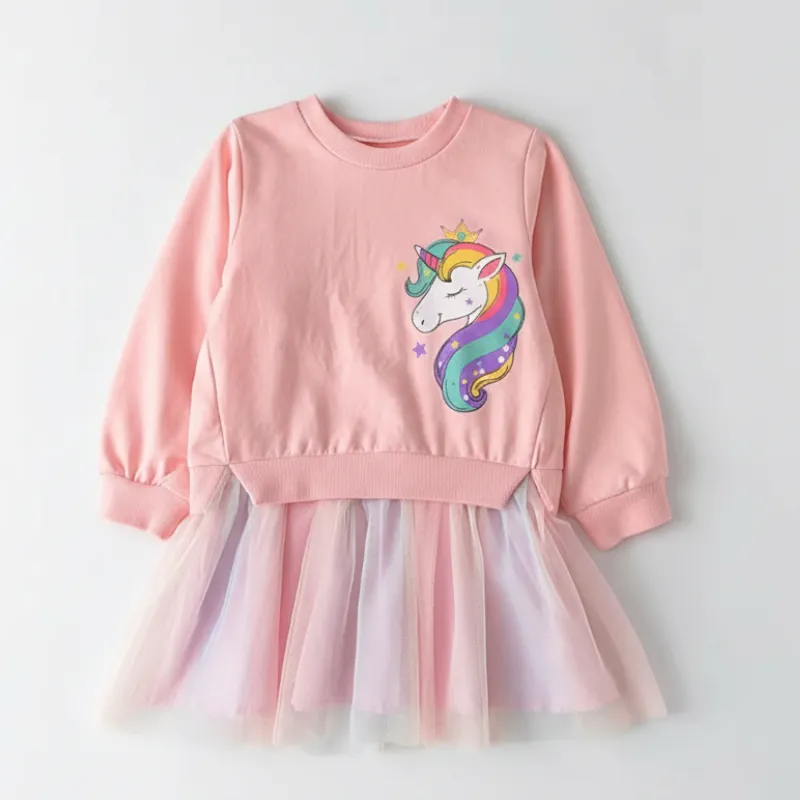 Fake Two-Piece Baumwoll-Einhorn-Langarmkleid für Kinder