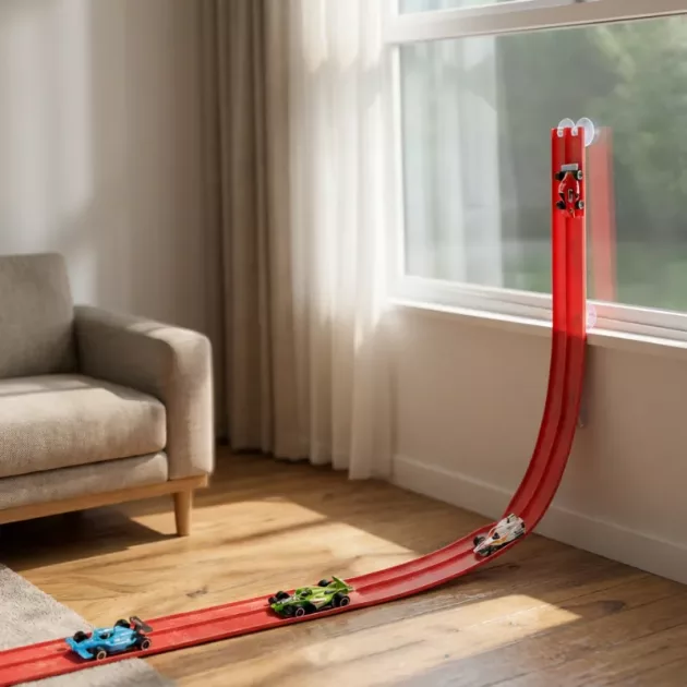 Ich finde es toll, dass ich fast überall eine Rennstrecke bauen kann. Mein Favorit sind Zickzacks an meiner Zimmertür. Die Saugnäpfe halten auch auf glatten Wänden.