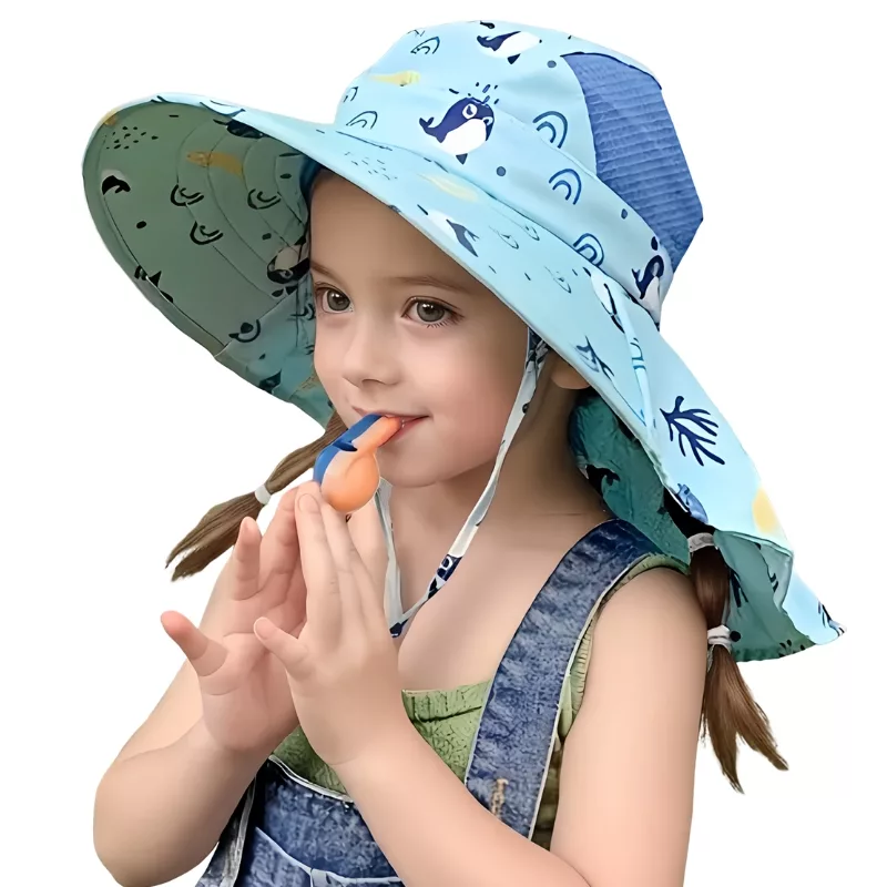 Wir benutzen den Hut beim Wandern und am Pool. Keine verbrannten Ohren oder Nasen mehr. Die Pfeife ist ein Bonus für Fangspiele mit Freunden.