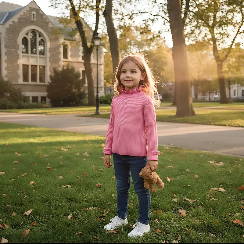 Meine Tochter liebt ihren Strickpullover! Er ist so weich, hält sie im Park warm und passt perfekt zu ihrem Stil. Er juckt sie nie, was super ist.