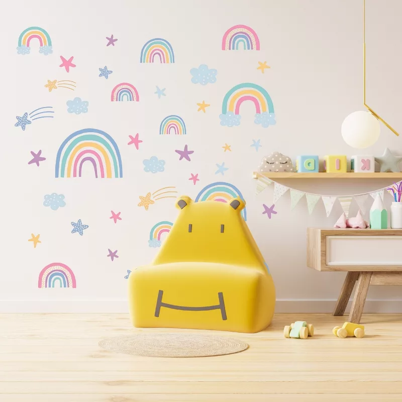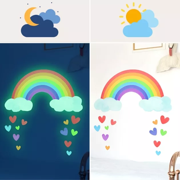 Wir haben diese süßen Regenbögen an die Wände unseres Spielzimmers geklebt, und die Kinder lieben es, ihnen nach dem Zubettgehen beim Leuchten zuzusehen. Einfach anzubringen und die Farben sind so lebendig.