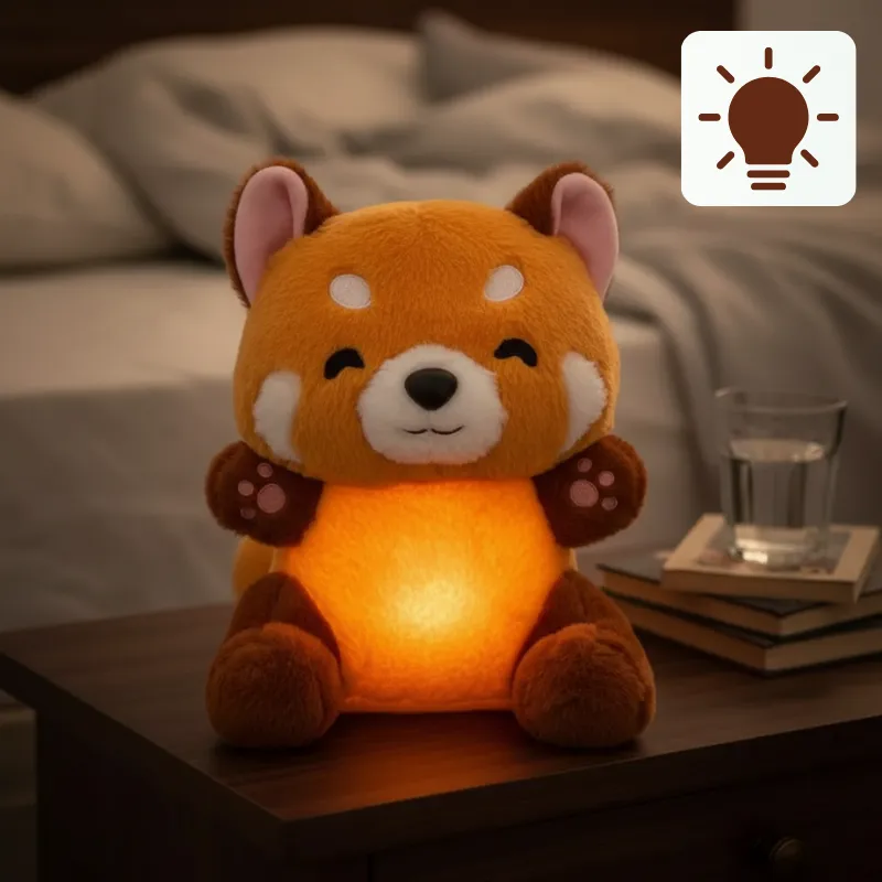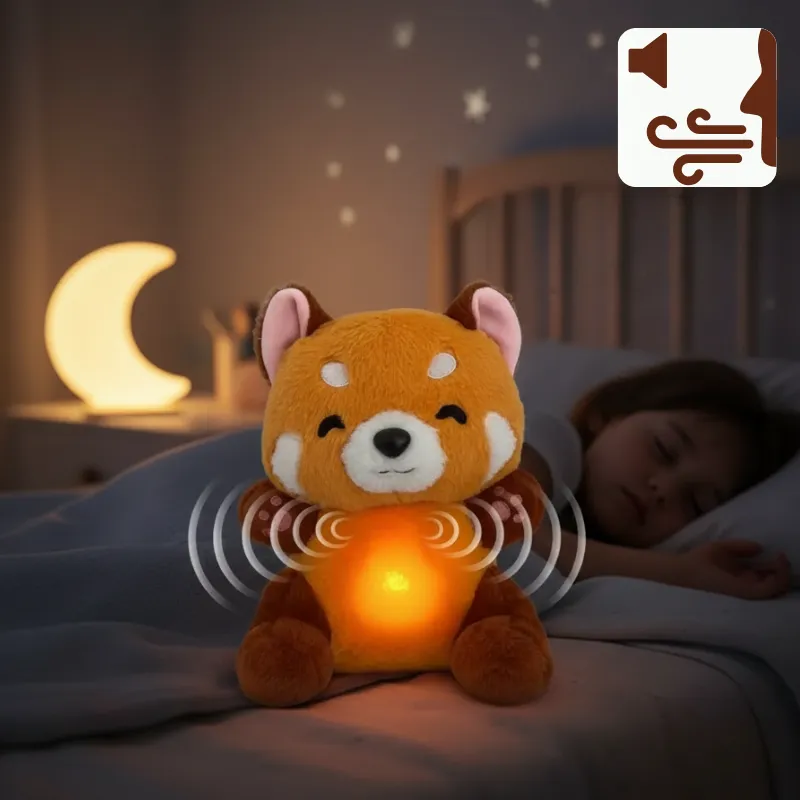 Jede Nacht fragt mein Sohn nach seinem Plüschpanda. Er schläft sanft zu den Schlafliedern ein, während das Nachtlicht neben ihm leuchtet.