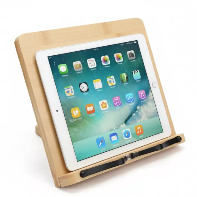 Dieser Ständer passt in meinen Rucksack, sodass ich ihn bei Oma benutzen kann. Das Bambus fühlt sich glatt an und zerkratzt meinen Schreibtisch nicht.