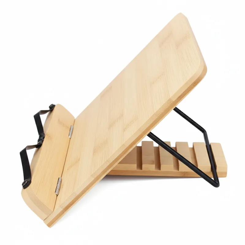 Dieser Ständer passt in meinen Rucksack, sodass ich ihn bei Oma benutzen kann. Das Bambus fühlt sich glatt an und zerkratzt meinen Schreibtisch nicht.